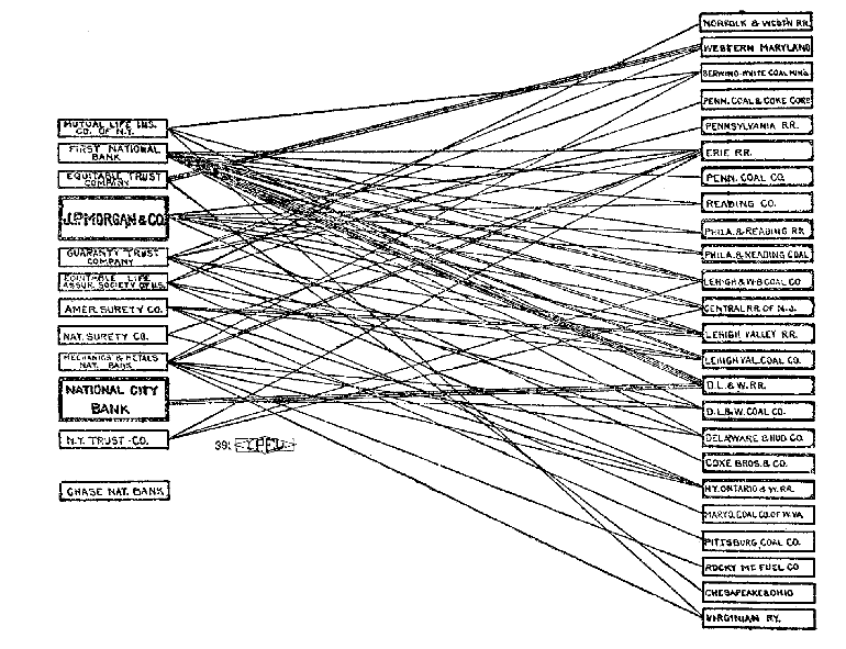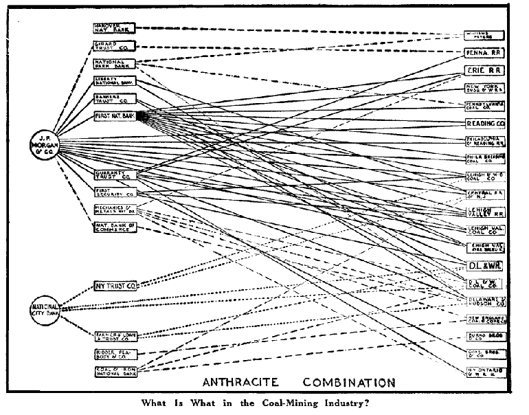 On the two "Who-is-who" charts herewith you will find listed the principal coal and railroad properties of the East as well as some of the biggest banks of the country. You see lines drawn from the banks to the railroads and coal-mine properties. Those lines represent interlocking directorates.