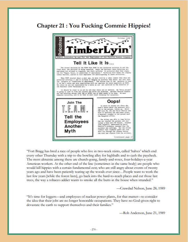 [82] “Timber Workers Gather in Redding”, by Glenn Simmons, Humboldt Beacon and Fortuna Advance, August 24, 1989. Evidently Simmons saw no contradiction in identifying management and executives as “workers”.
