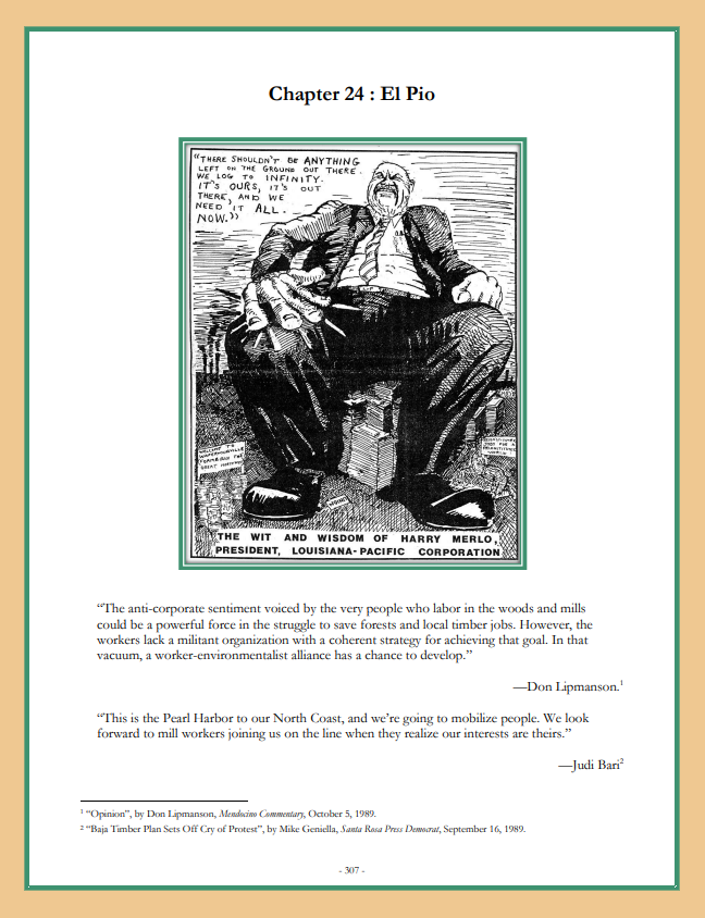 [54] El Pio, lyrics by Darryl Cherney, music by Darryl Cherney and George Shook, from the album Timber, 1991; Cherney actually wrote this song for Judi Bari’s two daughters. The last verse was later altered, and the first two lines were changed to: “Then one day he gets news that causes him great concern-o / When he finds out that both of his feller bunchers have been sterno-ed.” The reasons for this change are described several chapters later.
