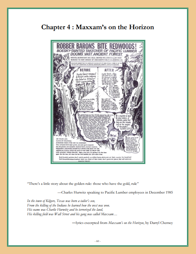 His killing field was Wall Street and his gang was called Maxxam…—lyrics excerpted from Maxxam’s on the Horizon, by Darryl Cherney
