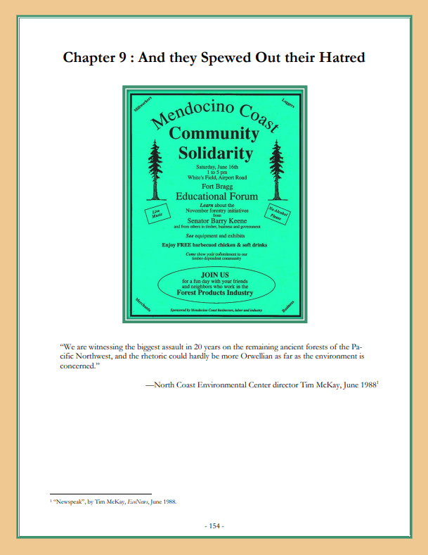 “…Earth First! is threatening more than our jobs. They are threatening to undermine the tax base and the standard of living throughout the county. Few Earth First!ers even live in Humboldt County. Fewer still pay property taxes here. Earth First! isn’t helping to solve community problems. They sure aren’t acting like they understand our economy. And they don’t care about the people who live here.” [39]