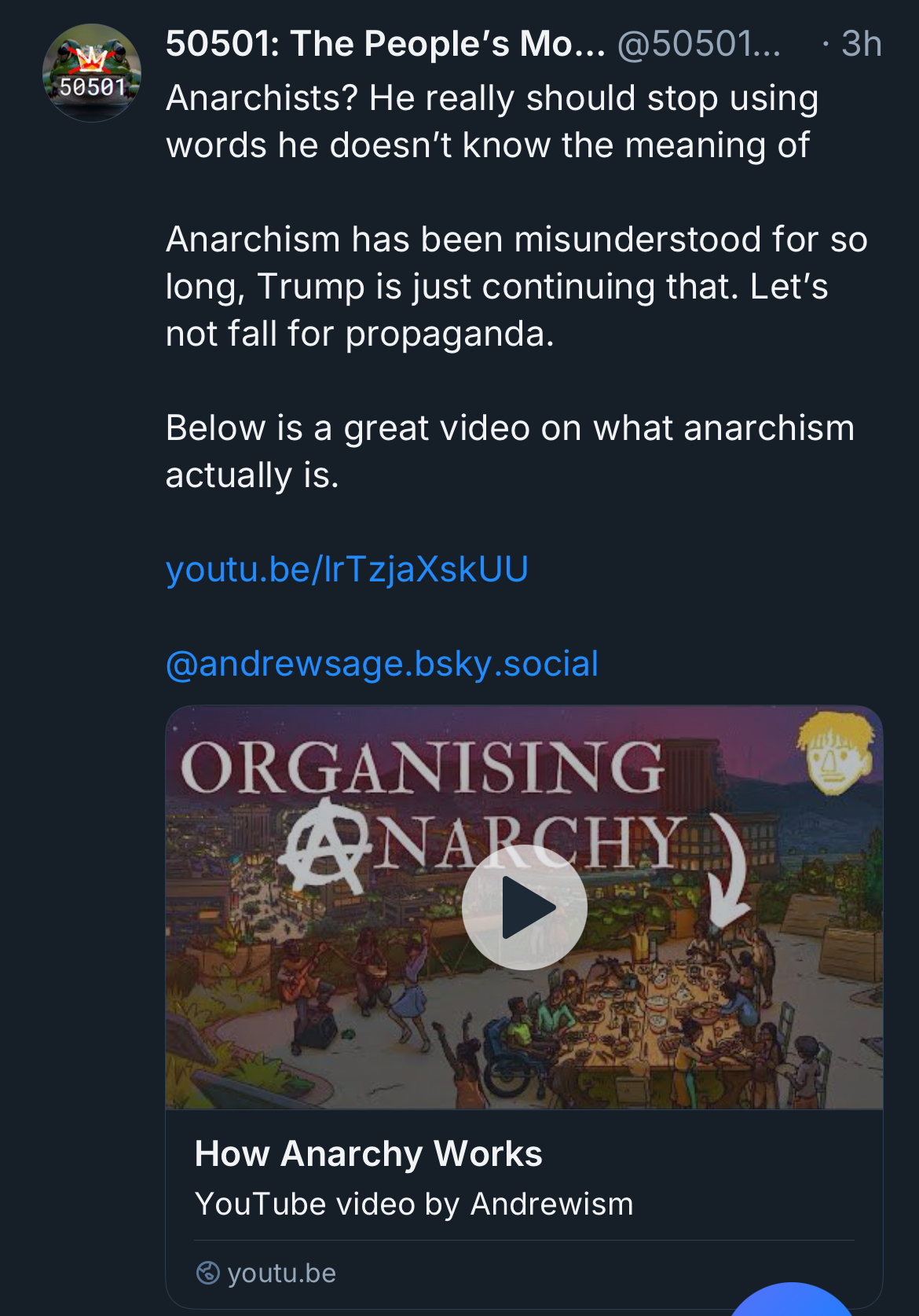 Here is another 50501 Bluesky screenshot of a post with a link to a favorable video on anarchism that explains what it is and what it isn’t (in response to Trump trying to stoke fears about it):