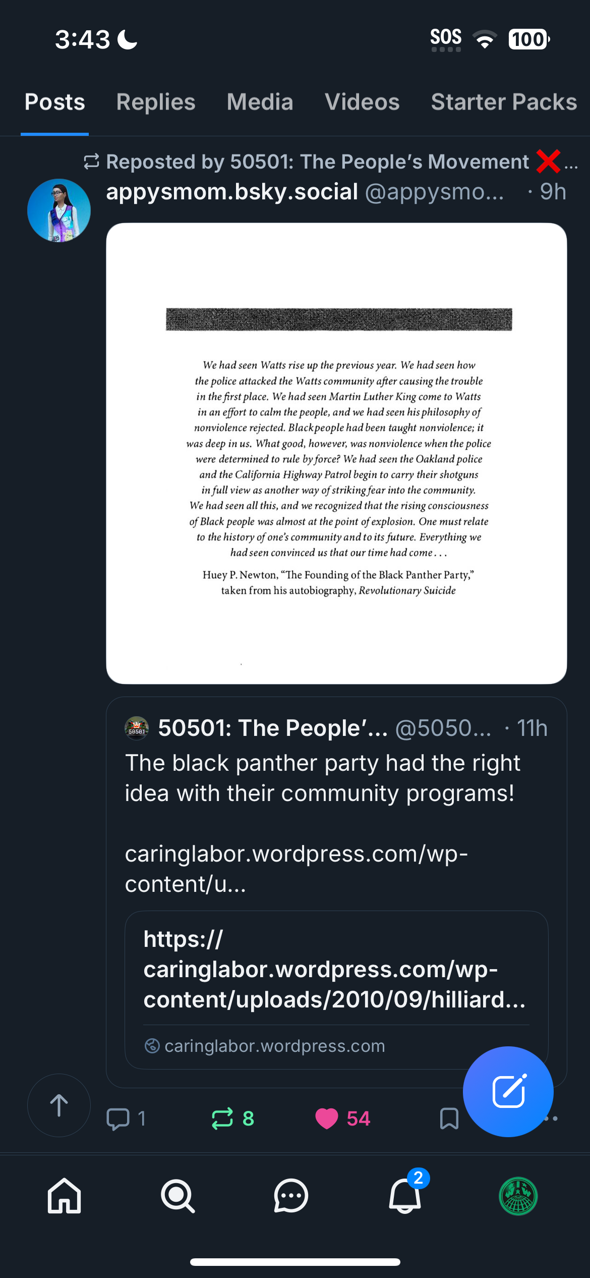 Here is a screenshot of 50501’s Bluesky page speaking favorably of the (Marxist-Leninist) Black Panther Party’s breakfast program (an example of mutual aid in practice):