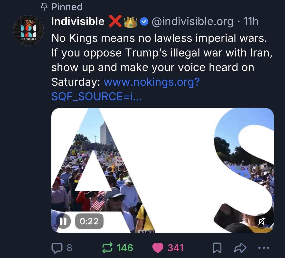 Here is a screenshot of Indivisible stating, quite unequivocally, their opposition to Trump’s war of choice in Iran, and why “No Kings” implicitly includes opposition to such things: