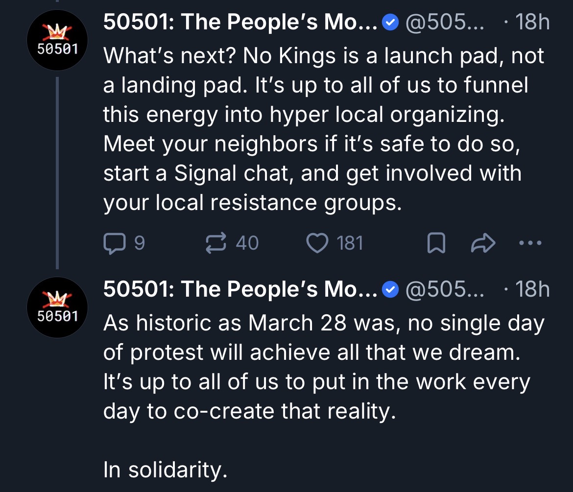 Obviously, given the above, if there were general strikes called by the workers in response to authoritarian backsliding, or called proactively to push for progressive changes, they’d be highly effective, certainly more so than mere mass demonstrations. The problem is: the ability to do so requires far greater organization among the working class in most countries than currently exists. Certainly, we should be building that capacity (and most, if not all, of the organizations behind “No Kings” would heartily agree as this screenshot shows: